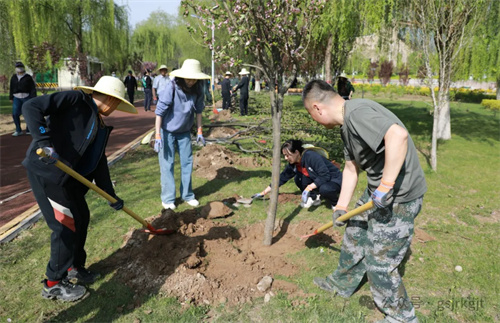活动当日晴空万里,在公园专业技术人员指导下,集团领导率先垂范,与干部职工“并肩奋战”,大家分工明确、协作有序,共同栽种海棠、榆叶梅、碧桃等观赏树木和牡丹、月季、绣球等花卉,为黄河之畔再添新绿。泥土芬芳中,铁锹与笑语和鸣成曲,青年团员们自发组成“搬运苗木小分队”穿梭奔忙保障供给;部分女职工组成“杀菌沃土先锋组”,精准投放药剂为土壤消毒;由青年党员组成的“乔木攻坚团” 更是勇挑重担,主动承担种植冠幅大、重量重的海棠、碧桃等乔木的任务,喊着口号扶正碗口粗的树干,覆土时反复校准树干垂直度,各小组默契配合,现场一片热火朝天。随着“种植先锋队”完成最后一株月季栽种,历时三小时的连续奋战,295株新苗在公园内指定规划区域内安家落户,形成“春观海棠、夏赏绣球、丁香独秀、月季连廊”丰富的景观带。